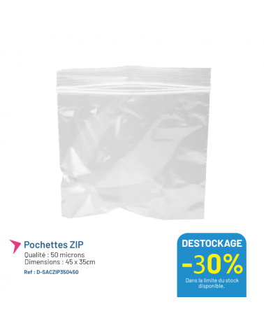 Promo -30% Pochette ZIP - 350x450mm - Lot de 1000 Sac ZIP - Pour le conditionnement de petites et moyennes pièces ! Dimensions : 350 x 450mm - 50µ - Colis de 1000. Déstockage : -30% 0,14€... À partir de Prix 139,55 € Prix 199,35 € -30% HT