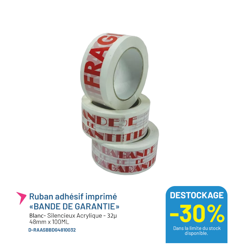 Ruban adhésif 48mm x 100ML - Blanc avec impression "BANDE DE GARANTIE"- Silencieux acrylique - 32µ.