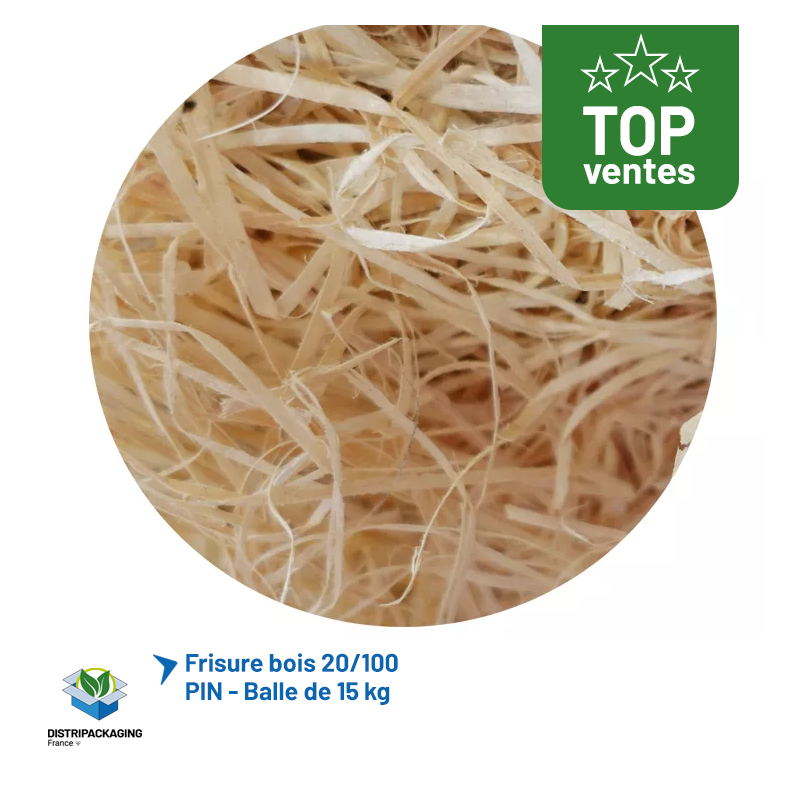 La frisure de bois de pin 20/100 est un calage naturel apprécié pour sa double fonction : protéger les produits pendant le transport et améliorer leur présentation au moment du déballage. La fiche Distripackaging la présente comme une solution adaptée aux produits fragiles, aux coffrets cadeaux, aux paniers garnis et aux colis haut de gamme, avec des fibres de bois non traitées.